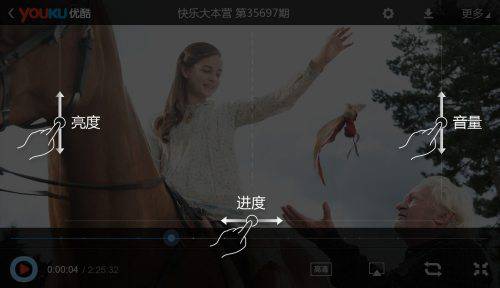 手指在视频画面右侧上下滑动便可跳出亮度调节功能,在左侧上下滑动会跳出音量调节功能。如下图所示: