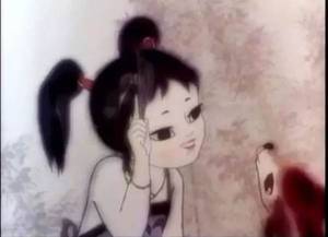动画景美、人美、音乐动听,让人心旷神怡。动画中的小姑娘给人的印象尤其深刻,大眼睛、红红的小嘴巴,粉嘟嘟的小脸,梳着高高的双马尾,美丽又可爱。传统的水墨画中人物往往以神取胜,这个小姑娘则形神俱美。