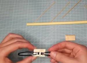 再用两根皮筋,作为发射的动力,绑在纸盒的翘边的地方,皮筋可以选用紧一点的,防止在发射的时候松掉