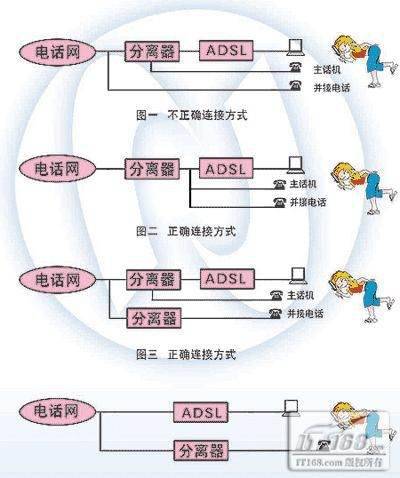 需要说明的是信号分离器和外线之间不能有其他的电话设备,任何分机、传真机、防盗器等设备的接入都将造成ADSL的故障,分机等设备只能连接在分离器分离出的语音端口后面。如果在PC旁边不需要电话,可将电话线直接连接ADSL调制解调器,分离器安装在话机前。
