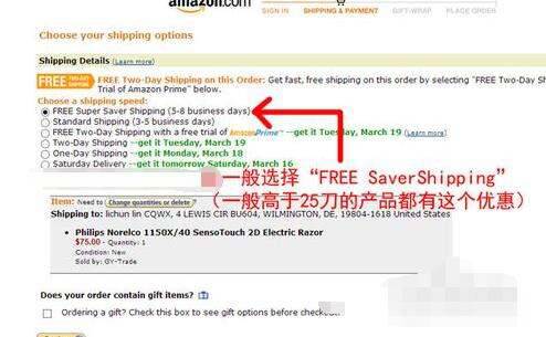 一般选择免费的“FREE Super Saver Shipping”速度比较慢,但无所谓,跟普通运输就相差两三天而已。