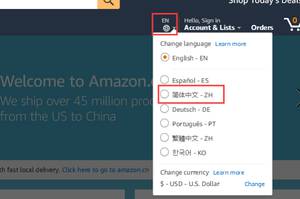 2、打开进入美国亚马逊网站以后,点击左上角的地球标志,选择简体中文(方便浏览)。
