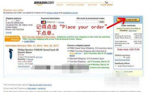 8.最后,确认物品价格和运费,要记得点击确认订单按钮“Placeyour order”,不然购物不算完成。提交订单后如果要查看订单状态可以转到“您的订单”(“Your Orders”)页面查看。亚马逊会发一份单到注册的邮箱里。