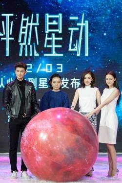 这是2015年11月18日由杨幂、李易峰主演的爱情喜剧电影《怦然星动》片方在北京举行的发布会,主演杨幂、张云龙、迪丽热巴和嘉宾周笔畅出席,该片于2015年12月3日上映。图片是发布会上,主演杨幂和迪丽热巴进行互动。