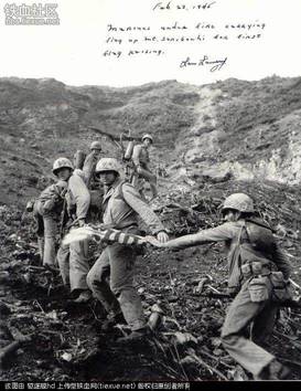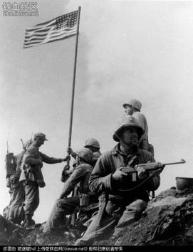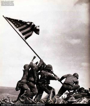 图:这张照片是一张摆拍,当摄影师来到制高点后,发现国旗已经竖上,他们便商议,从登陆舰中拿来了一张更大的国旗,由六名海军陆战队员重新竖起,从而才有了这么经典的一幅画面。