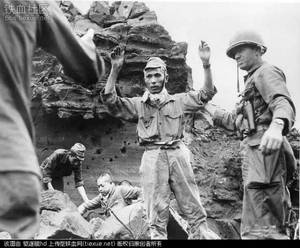 图:美国大兵将投降的日本士兵从岩洞里拉出来,虽然美军的伤亡极其惨痛,但他们还是优待了日军俘虏。日军除了1083名军人被俘外,剩下的22305士兵全部阵亡。