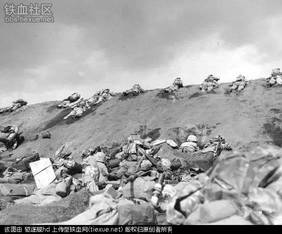 图:山坡上趴满了被流弹击毙的美军尸体,一波人牺牲后,另一波人就会很快的顶上去。日军为了守卫硫磺岛,每一个士兵都作好了牺牲的准备,指挥官更是下令:“不允许自杀式袭击,每个人必须击毙10个美国士兵才能死。”