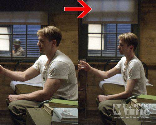 3.制作组并没有在演员身上使用追踪按钮,他们更加倾向于保留原始的纹理。在每一个“瘦小的Steve(美国队长的名字)”的镜头中,为了体现出身形特征,克里斯·埃文斯穿着一件超大的大衣和帽子,就好像是被大衣吞下一样。克里斯每步会迈4英尺,缩小后的角色每步只有3英尺,因此他要接受一项被称之为“格洛克·马克思(著名滑稽演员)”的训练。如果他坐着车,就要低下头一些;走路的时候屈膝,使身高降低6英寸;然后团队只要再修整他的腿部使其看起来和正常人一样,如此一来就不需要替换画面的背景并且掩盖替身的头部了。这种方法特别有用,尤其是在主角的背后有一大群人的时候。
