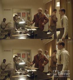 8.为了一些特殊场景,克里斯到Lola单独表演了2个小时作为数据捕捉,用于制作3D模型,以投射到Leander Deeny的身体上,这一段用的是《社交网络》的技术。合成的范围是从发际线到下颚线,左右范围在两耳之间。Leander与克里斯的双耳截然不同,所以还需要对它们进行修改来使其匹配。这些镜头使用的数量只有5%,其中最典型的一个镜头是瘦弱的主人公在半裸着在招聘中心,那个身体是Leander Deeny的。其余的这些镜头中,替身主要的作用是打光和建模的参考。