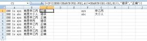 在C1输入=IF(ISERR(SEARCH(F$1:F$2,A1)*SEARCH(G$1:G$2,B1)),"错误","正确")