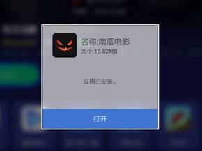 13、安装完成之后,弹出安装完成打开界面,移动遥控点击【打开】即可进入《南瓜电影》首页。