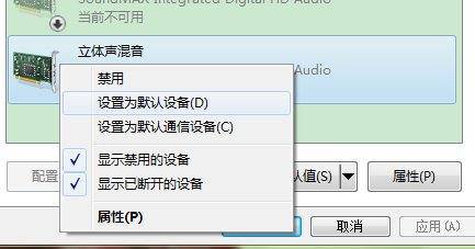 2.把“立体声混音”设为“默认设备”,如果没有“立体声混音”就得装声卡驱动了