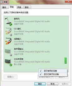1.右键点右下角喇叭图标>录音设备,勾选“显示禁用的设备”