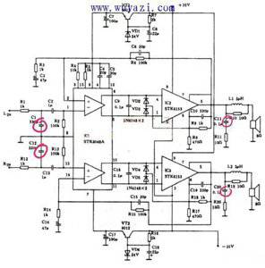 首先要有一个输出功率比较大的功放机,才能推动8吋以上的低音喇叭,此外音箱喇叭还要用分频器带动,这样音响的音质才会好,否则就是再怎么努力,音质也不怎么样。比如功放机输出功率只有3、5瓦,再在电路中采取对音频电路怎么改善,也没有什么效果。因此要想提高功放机音质,就要先有硬件,才能有条件改善音质。如果你的音响音质有点干炸,不柔和,在音频输入端对地接,加大该电容器容量试试,不能加的太大,太大了声音发闷。如图(画红圈的电容器):