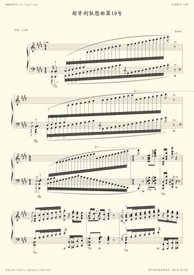 10。E大调,约作于1850年,其前奏曲为 习作《匈牙利狂想曲》的第十六号转用,献给埃格莱西(Egressy Beny)。4小节前奏曲后,进入明确 的行板,E大调,“拉赛”部分o“弗利斯卡”部分为随想曲风格的稍快板,技巧华丽,终结部为颇似游戏的最急板。