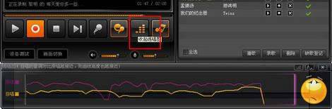 找一首喜欢的歌曲,点击“录歌”按钮就可以开始录制歌曲了。此时只要跟着音乐演唱即可。软件会把你的声音录制下来。怎么知道自己唱的对不对好不好呢,酷我K歌还专门提供了“练唱图”功能,在录制过程中只要单击“显示练唱图”按钮即可显示一个图示窗口,在这个窗口中会显示两条曲线,一条是原唱曲线,一条是自唱曲线。在录制过程中软件会根据你演唱的音调和音准等用曲线进行对比,两条曲线越接近说明唱得越准,反之则越差。同时还会用一个笑脸娃娃同步提示你应该注意什么,比如声音太大,唱得跑调了等,很有意思。有这样的练唱图示做指示,演唱起来心中就更加有谱了,会越唱越好。