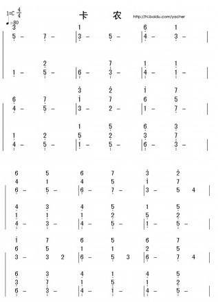 卡农Canon是一种曲式的名称,这种曲式的特征是间隔数音节不停重复同一段乐曲。一般的演奏法是以大提琴启奏,三把小提琴间隔八拍先后加入,小提琴全部拉奏完全相同旋律,前后也只有三段不同的旋律,每段更是仅有两小节的旋律供重复拉奏;大提琴的调子从头到尾只有两小节,重复达廿八次之多,可是听者却陶醉在这旋律之中,丝毫不会感到单调。能御简如繁,作者可说已臻化境。