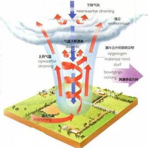在龙卷风周围空气会绕龙卷的轴快速的旋转起来,受到龙卷中心气压迅速减小的吸引,会在地面形成几十米厚的一薄层空气,在这个范围之内气流都被吸入龙卷风涡旋的底部,并随即转变为围绕轴心向上的涡流,龙卷风的涡流总是气旋性的,其中心的气压比周围的气压低百分之十。