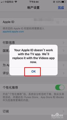 再接着,如果当时进入到英文界面,也是无法下载需要的应用而不小心设置了英文界面的话,此时进入这个界面,会提醒(你的苹果ID不适用于电视应用程序。我们现在用视频应用取代它),点击【ok】确认一下就可以了。如图所示