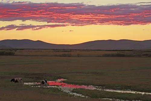 夕阳把草原染成通红了这句诗出自艾青的短诗《刈草的孩子》。