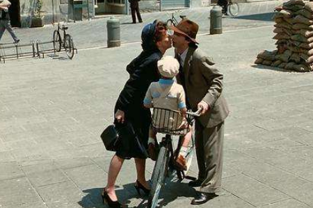 基度用自行车载着美丽的妻子,车筐里坐着机灵可爱的儿子,在街道上飞驰而过。