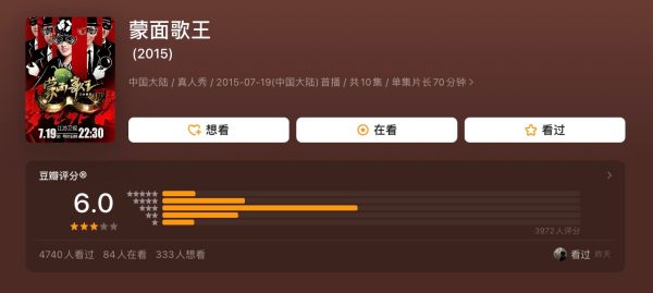 推荐理由:这个节目是我在大学期间观看的,节目中所有的明星歌手均以面具遮面,观众无从辨别歌手身份,所有的评分标准只以歌手的歌声为考量依据。这种结合了“音乐+悬念”的表现形式,让所有歌手都在面具下回到同一个起跑线,趣味性很强。