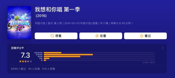 推荐理由:这个节目的形式很新颖,这也是吸引我来观看的主要原因。《我想和你唱》在借助新的参与互动方式,完成对传统挑选音乐素人模式的再造上做了"第一个吃螃蟹的人"。节目在播出期间热度很高,节目做的很有质量,明星和观众的互动也很有看点。