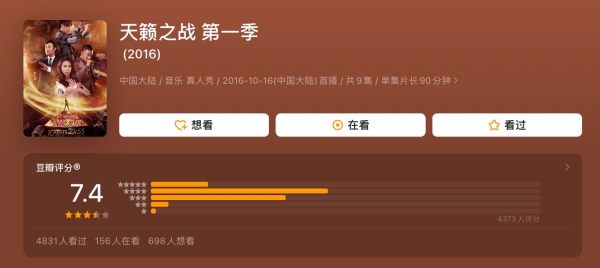 推荐理由:看惯了平时的嘉宾全是明星的音乐综艺,看一部《天籁之战》对我来说也是耳目一新的选择。节目给了素人歌者们一次勇于向明星发起挑战的机会。同时,素人拥有了更多自主选择的权利,他不仅可以直接选择一位明星歌手作为竞唱的对象,而且还为明星歌手选择对战的歌曲,并在平等、公正的舞台上与明星歌手同台竞唱,是很好看的。