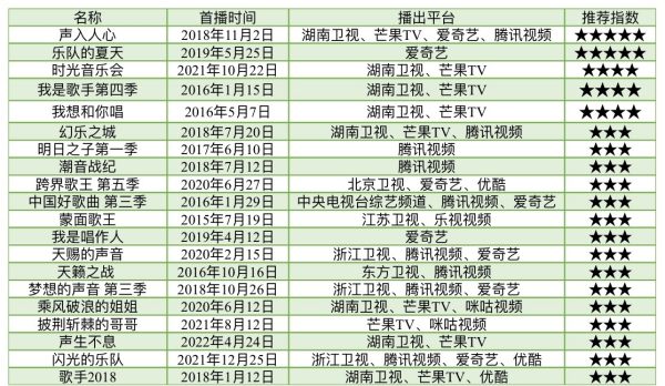 上面提到的20部音乐综艺按照推荐指数排名的表格一览如下: