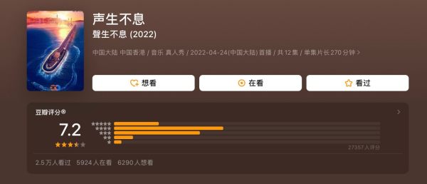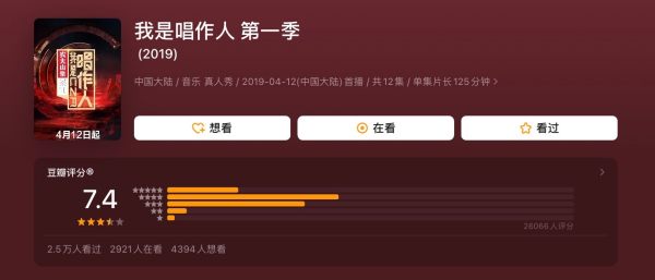 推荐理由:在我观看这部音乐综艺时,它最吸引我的点是《我是唱作人》节目中每位唱作人每周呈现一首从未公开发布的原创作品,整档节目带来92首全新歌曲。对于喜欢听音乐的我来说,真的是大饱耳福。