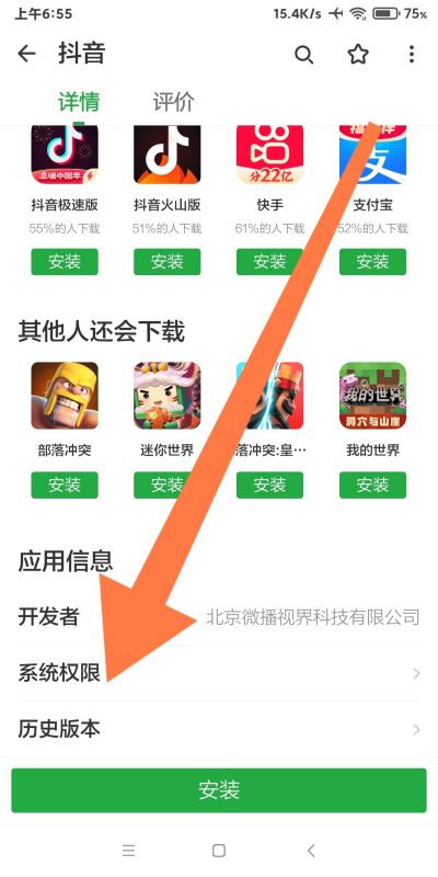 4、打开历史版本界面后向下滑动,然后点击旧版抖音右侧的“安装”按钮。
