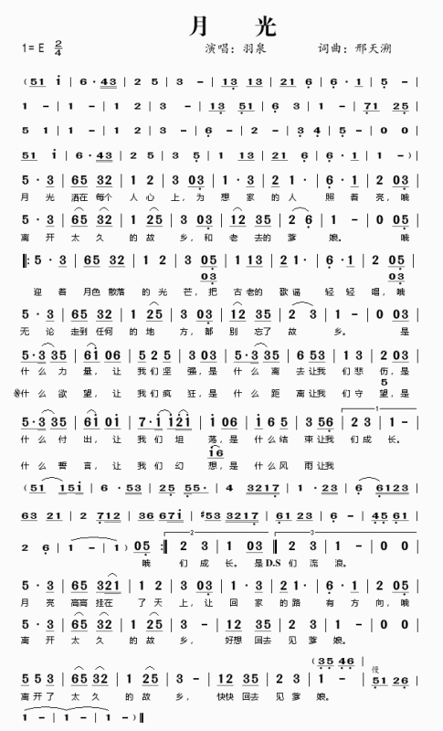 歌名:月光 歌手:羽·泉 歌词: 月光洒在每个人心上 为想家的人照着亮 噢 离开太久的故乡 和老去的爹娘 噢 迎着月色散落的光芒 把古老的歌谣轻轻唱 噢 无论走到任何的地方 都别忘了故乡 是什么力量 让我们坚强 是什么离去 让我们悲伤 是什么付出 让我们坦荡 是什么结束 让我们成长 噢 迎着月色散落的光芒 把古老的歌谣轻轻唱 噢 无论走到任何的地方 都别忘了故乡 是什么力量 让我们坚强 是什么离去 让我们悲伤 是什么付出 让我们坦荡 是什么结束 让我们成长 是什么欲望 让我们疯狂 是什么距离 让我们守望 是什么誓言 让我们幻想 是什么风雨 让我们流浪 月亮高高挂在了天上 让回家的路有方向 噢有一首歌,其中有句歌词是--有一种力量叫坚强--我很想知道名字是什么?请知道的朋友告诉我,谢谢。