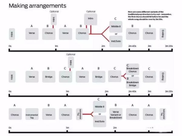 流行歌一般的结构:主歌,副歌和中段三位一体的结构。