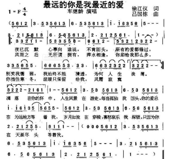 《最远的你是我最近的爱》是车继铃演唱的一首歌曲,沈陵填词,史俊鹏谱曲,赵新编曲,收录在专辑《最远的你是我最近的爱》中。