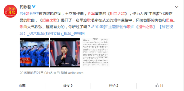 东方煜晓作词,王立东作曲,乔军演唱的《担当之歌》,作为入选“中国梦”代表作品的歌曲,《担当之歌》揭开了一名军旅歌唱家在从艺的艰辛道路中,怀揣着那份执着和担当。歌曲大气恢弘、铿锵有力的。