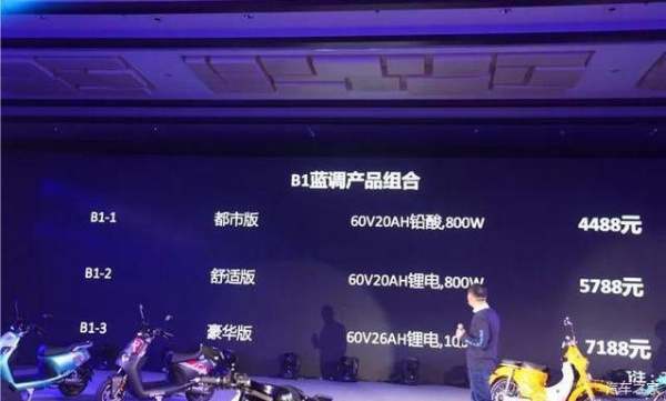 动力系统,蓝森B1总共有三个版本,分别为都市版(60V20AH铅酸,800W),舒适版(60V20AH锂电,800W)和豪华版(60V26AH锂电,1000W),参考售价分别为4488元,5788元和7188元,消费者可以根据自身的需求来选择。其中,舒适版和豪华版的官方续航能力为80公里和108公里。目前,蓝森B1蓝调总共有白色,橙黄色,红色和蓝色等四种车身颜色。