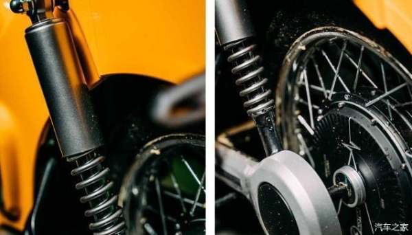 悬挂系统,前后液压阻尼弹簧式减震;刹车部分,常规的前后鼓刹,制动效果一般。其他参数方面,车身尺寸为1880*680*1020mm,轴距为1235mm,最小离地间隙为165mm,坐高为750mm,整车质量为68kg(不含电池)。