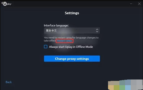 3、再点击Restart Uplay(重启Uplay) 就改为中文了。