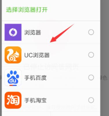 4、然后选择手机上安装的一个浏览器打开即可,随便一个,比如UC浏览器。