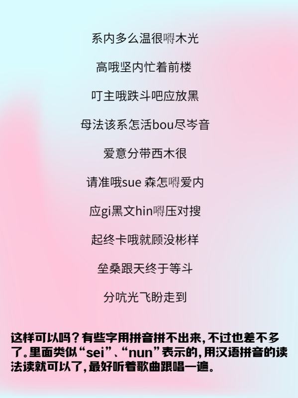 这样可以吗?有些字用拼音拼不出来,不过也差不多了。里面类似“sei”、“nun”表示的,用汉语拼音的读法读就可以了,最好听着歌曲跟唱一遍。