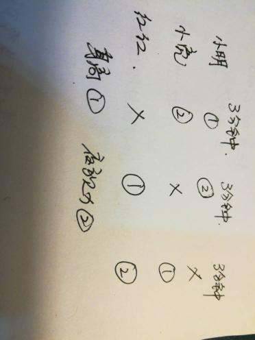 您这题有其他的理解方式,比如说写字的时候是可以三个人一起进行。 但是朗诵的时候只能是一个人进行。 这个时候只需要15分钟。 因为有两个人去写字,一个人去朗诵。 然后有一个人去朗诵,另一个人去写字。这就过了10分钟。 再加上最后一个的朗诵就是15分钟。【摘要】 小林小丽和小美同时去参加写字和朗诵两项测试每项测试每人五分钟+,由两位老【提问】 请您把这一道题补充完整以后,给我发过来,我再为您解答。 因为您发了一半的题目没有齐全。【回答】 小林小丽和小美同时去参加写字和朗诵两项测试每项测试每人五分钟由两位老师分别监考,他们最短多长时间能全部测试完【提问】 快点【提问】 最短只需要20分钟。【回答】三位同学要去测体重和量身高,每项检查要3分钟,他们至少要用多长时间