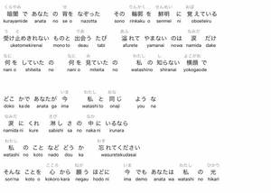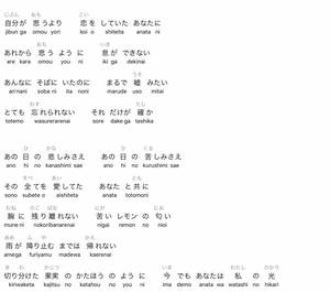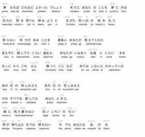 有麦那喇叭 都来后多 有噶大带修哦 姨妈大 你啊那他 no扣多我 有卖你迷路 瓦苏雷大漠 no我头里 你嘎哎都有里 俘虏比 大哦莫一代no后勾 一楼哈拉 魔都哇那一 西啊瓦赛 嘎阿鲁口逗我 撒已有 米啊那他 大哦西得 K哭累大 一叶子米卡 哭戏带她 哭拉一卡勾某 啊那他 嘎衣那 卡哎印尼 库拉一麻麻 ki头模 口累以一交 ki 字字苦苦 头那头 啊里瓦西 那一一头瓦 嘎带一路 啊no hi no 卡纳 系米黑撒哎 啊no he no 库鲁 系米黑撒哎 所农四倍台某 啊一喜帖他 啊那 嘎头 透某你 木内尼库鲁里 哈那哈类那 一你嘎一 lemon 农历哦一 啊买尬福利啊 木马叠瓦 卡也来那衣 姨妈米津玄师lemon的罗马音和中日歌词