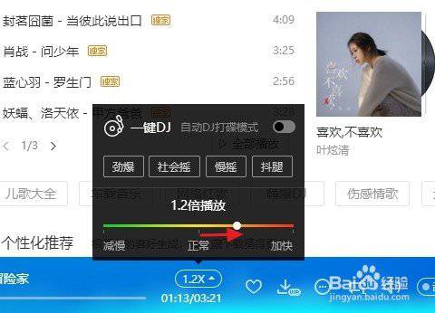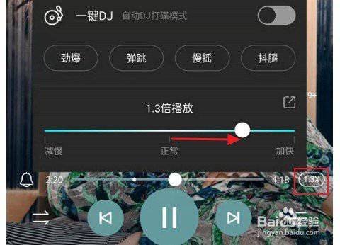 这时,我们可以根据需要选择倍速,如果需要音乐加快,我们可以点住这个圆点从中间处向右滑动,这时在歌曲进度条后面的倍速也会随之变化。加快倍速最低是1.1倍,最高是1.5倍。