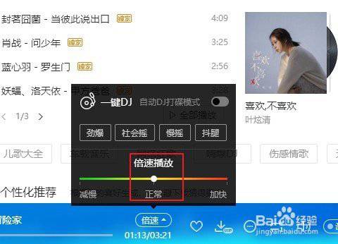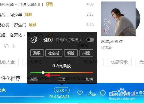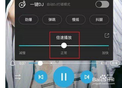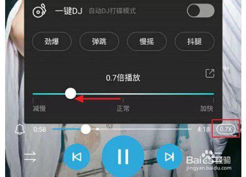如果需要音乐减慢,我们就点住这个圆点从中间处向左滑动,这时在歌曲进度条后面的倍速也会随之变化。减慢倍速最低是0.5倍,最高是0.9倍。比如我们听Rap时就可以利用倍速减慢的方法来听清歌词。