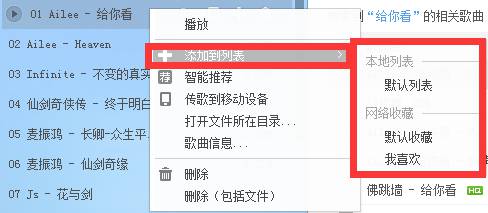 6、这时候点击本地列表,右击想要听的歌曲选择添加到网络收藏自己创建的歌单中(可以创建多个,分类放在一起),如图。